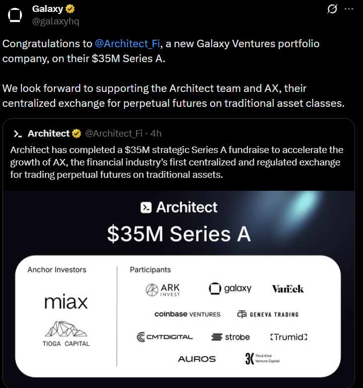 Во вторник The Information сообщила, что стартап Харрисона Architect Financial Technologies использует финансирование для создания институциональной торговой платформы, охватывающей деривативы, акции, фьючерсы и цифровые активы. В раунде приняли участие Miax, Tioga Capital, ARK Investment, Galaxy и VanEck.