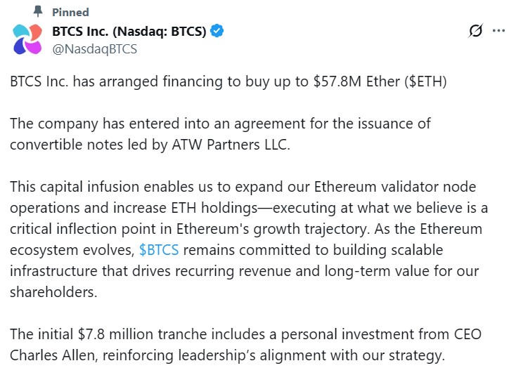 Общедоступная компания BTCS объявила о соглашении о финансировании в размере 57,8 млн. Долл. США во главе с инвестиционной фирмой ATW Partners для покупки Ether, поскольку она расширяет стратегию инфраструктуры блокчейна.