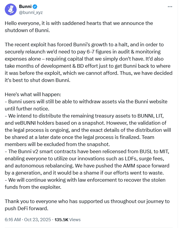 Децентрализованная биржа Bunni объявила о своем закрытии после эксплойта стоимостью 8,4 миллиона долларов в сентябре и теперь является второй командой криптовалютного проекта, которая сдалась на этой неделе, сославшись на сложные обстоятельства.