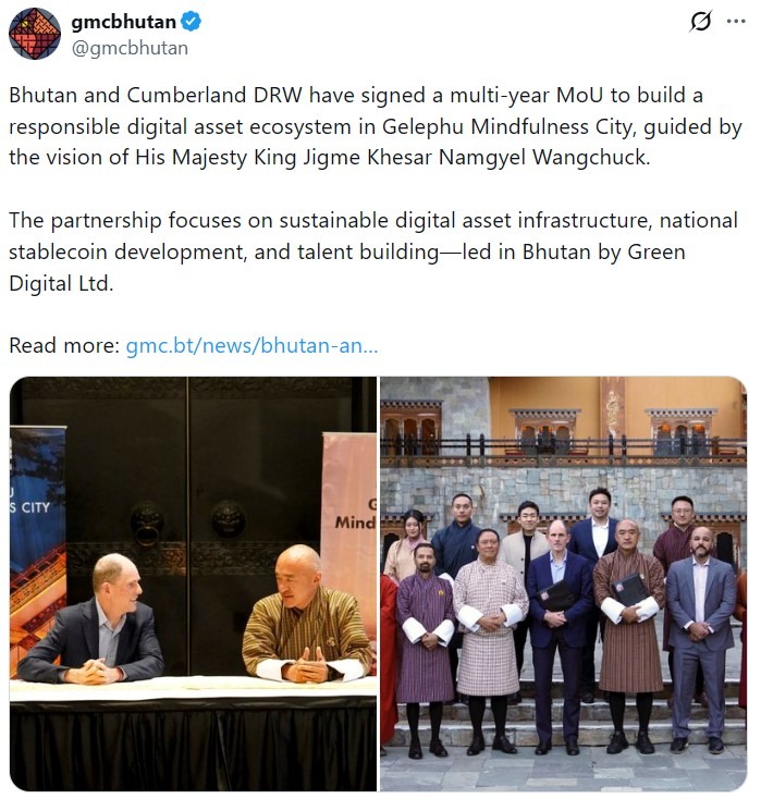 Бутан подписал многолетний меморандум о взаимопонимании (MoU) с производителем криптовалютного рынка Cumberland DRW о сотрудничестве в создании инфраструктуры цифровых активов в Городе осознанности Гелепху (GMC), что углубляет долгосрочную, ориентированную на устойчивое развитие криптовалютную стратегию страны.