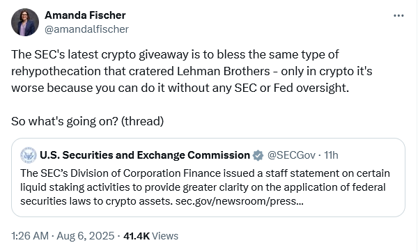 «Последняя раздача криптовалюты SEC – это благословить тот же тип режипотекации, что и Brothers, – только в криптовалюте это хуже, потому что вы можете сделать это без какого -либо надзора SEC или Fed». Фишер сказал.