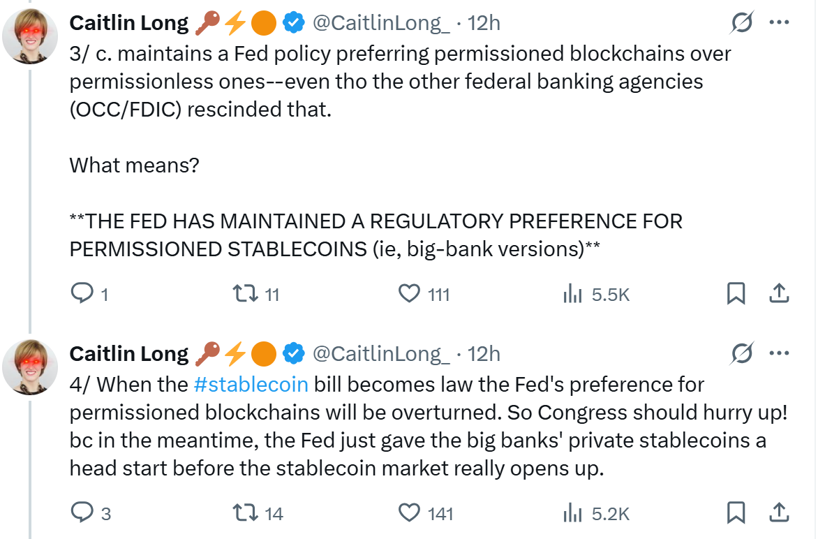 Кейтлин Лонг, основатель и генеральный директор Custodia Bank, подверг критике Федеральный резерв США за тихо поддержание ключевой политики антикриптовалюты, которая способствует выпущенным крупным банкам стаблеков, несмотря на расслабляющие правила партнерства в криптовалюте для банков.