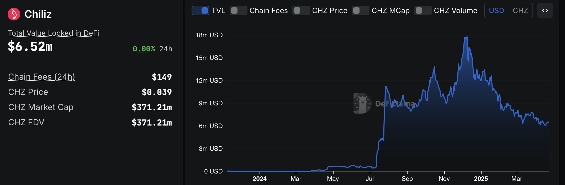 Chiliz, несмотря на партнерские отношения с футбольными клубами, игровыми командами и гоночными компаниями, наблюдает значительное снижение активности в своей экосистеме. Данные Defillama показывают, что общая стоимость протоколов упала с 17,8 млн. Долл. США 9 декабря 2024 года до 6,5 млн. Долл. США 22 апреля 2025 года, что составило 63,5%.