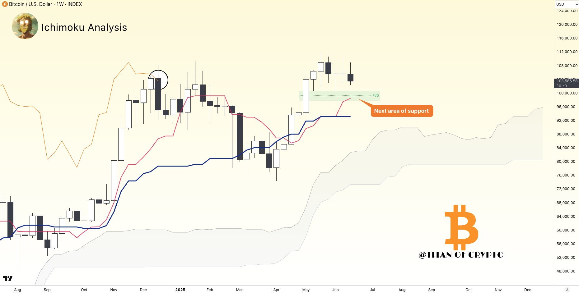 Используя диаграмму цен на биткоин на еженедельные сроки, следующий значимый уровень поддержки составляет около 99 000 – 100 000 долларов. Слияние разрыва в справедливой стоимости (FVG) и роста Tenkan-Sen (Red Line) вокруг этой ценовой области делают зону значительной площадью для наблюдения за тем, сохраняется ли давление продажи.