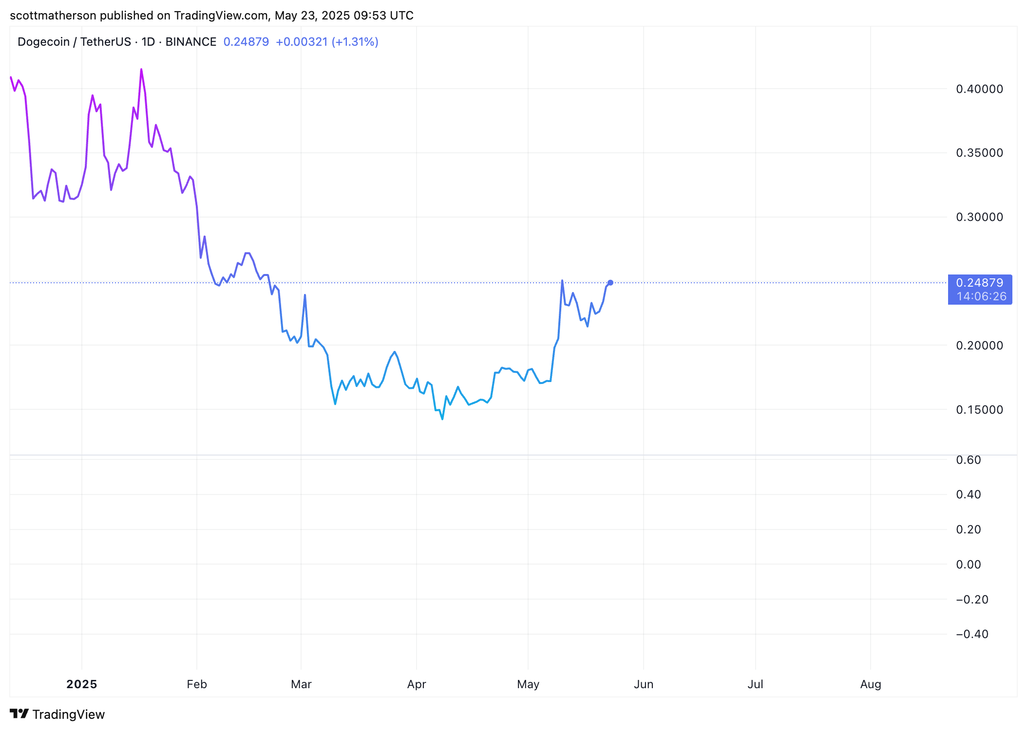 Недавнее ценовое действие Dogecoin приняло заметно бычий поворот: монета Meme отрывалась от поддержки в начале недели и неуклонно наращивая импульс. За последние несколько дней Dogecoin находился на пути к восстановлению уровня 0,25 долл. США после восстановления с низкого уровня около 0,215 долл. США. Этот восходящий шаг совпадает с всплеском Биткоина до новых рекордов, которые помогли внести новую уверенность на более широком рынке криптовалют.
