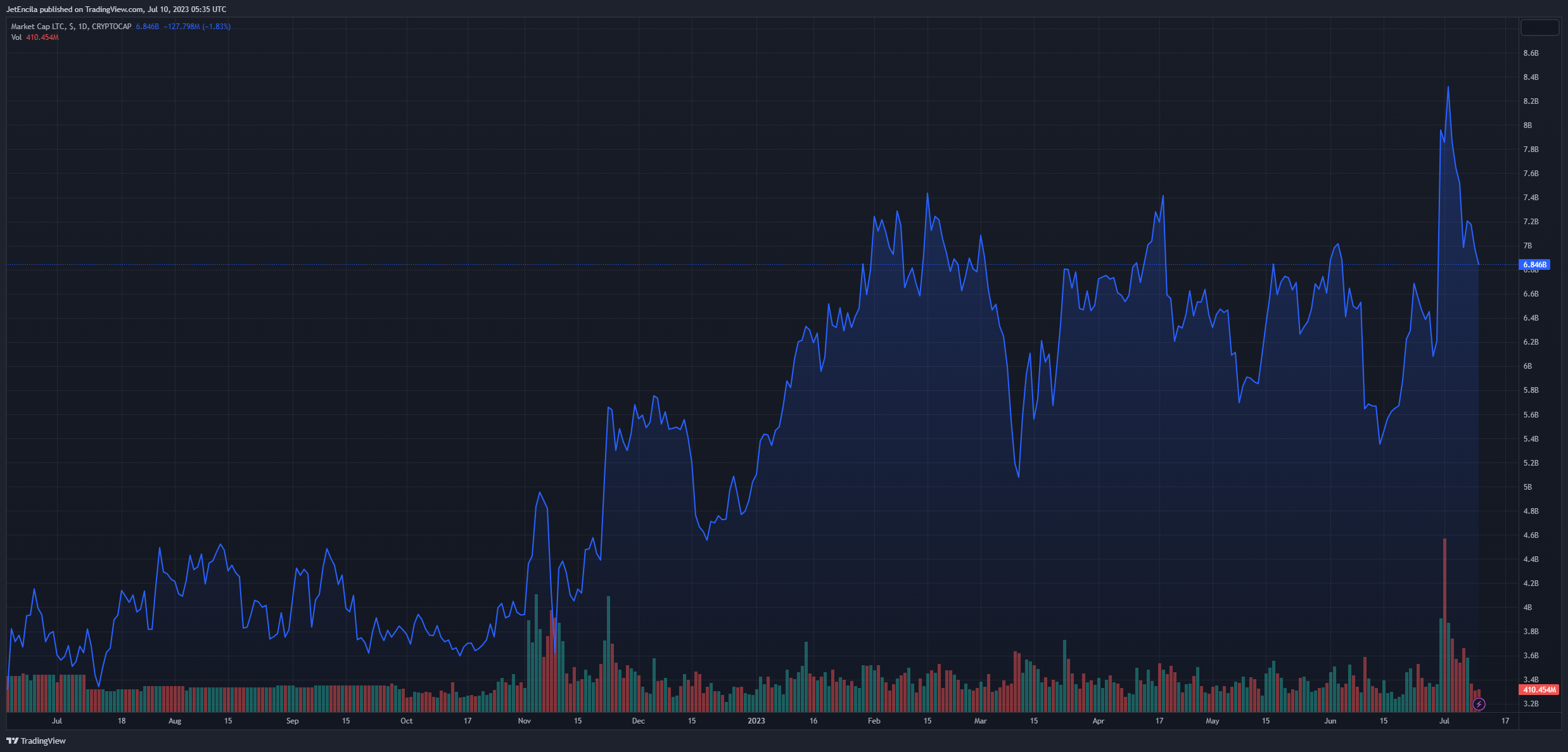 Рыночная капитализация LTC в настоящее время составляет $6,8 млрд на дневном графике: TradingView.com
