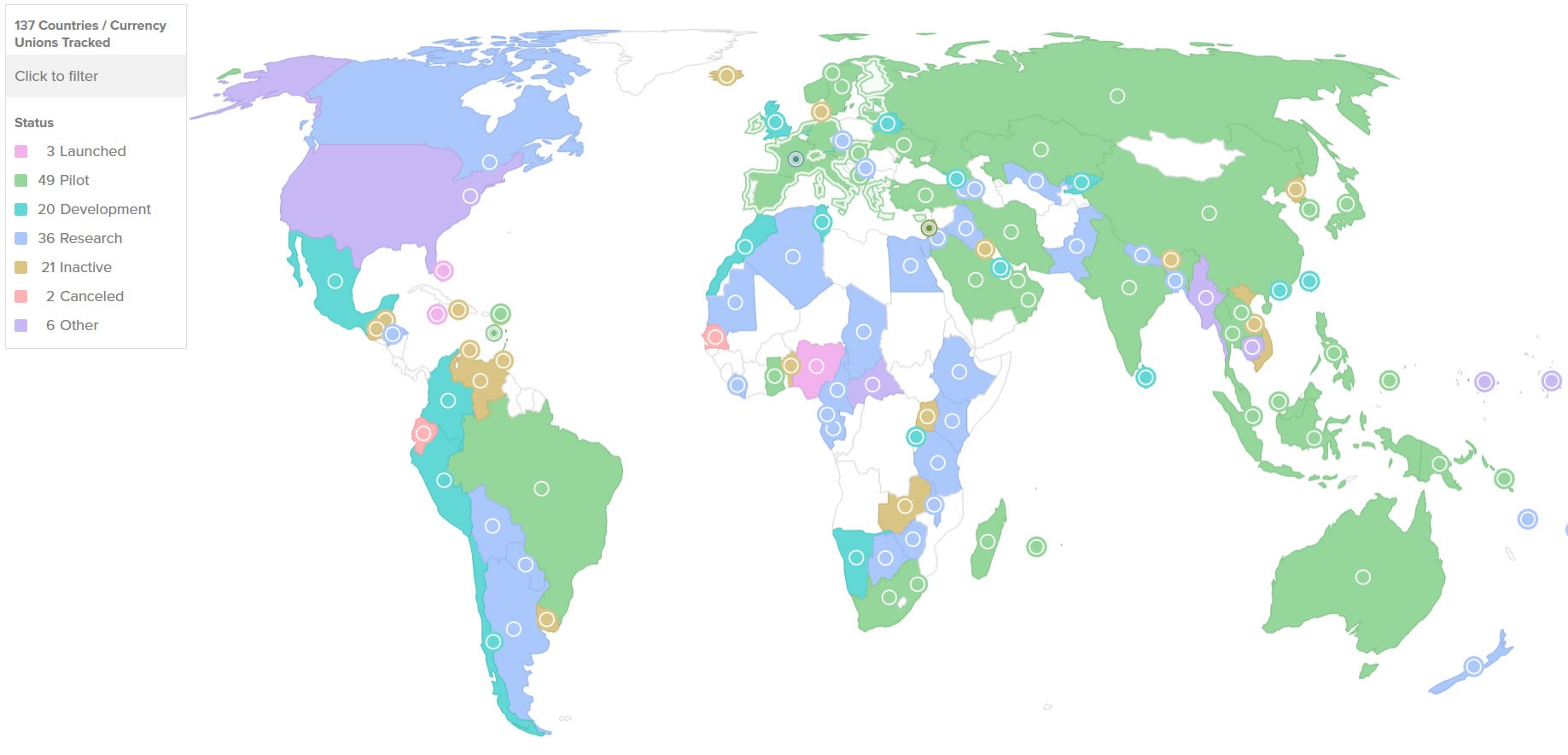В 49 странах CBDC находятся на этапе пилотного тестирования, в 20 странах они активно разрабатываются, а 36 стран исследуют CBDC. Тем временем Соединенные Штаты отложили свои планы CBDC при администрации Трампа.