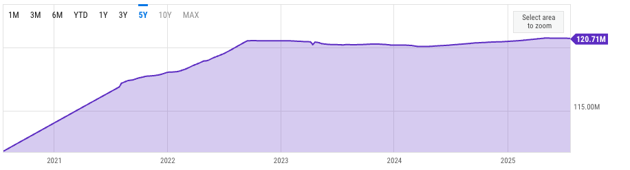 Согласно данным YCharts, предложение Ethereum постоянно росла с 2020 по 2022 год, достигнув 120,5 миллионов ETH к сентябрю 2022 года.
