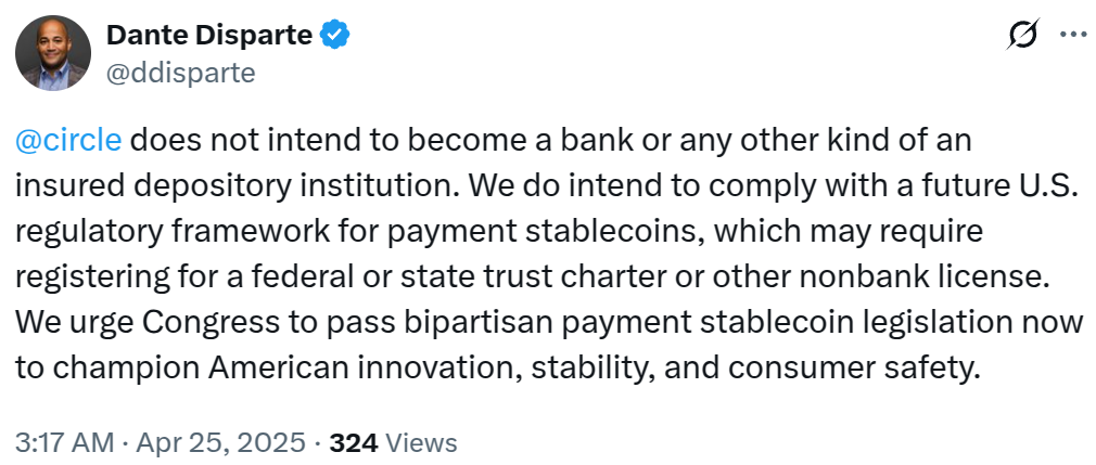 Вместо этого он объяснил, что Circle намерен соблюдать будущие нормативные требования США для платежных стаблеков, «которые могут потребовать регистрации для федерального или государственного трастового хартии или другой небанковской лицензии». Он также призвал законодателей достичь ясности регулирования для стаблеков раньше, чем позже.