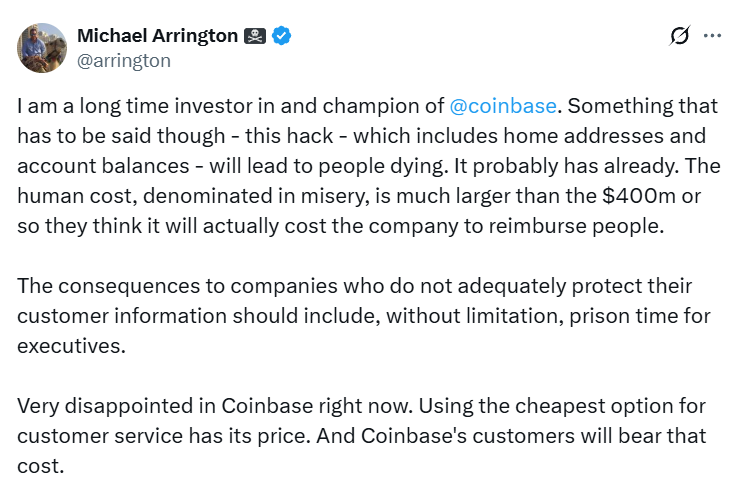 Новые меры Армстронга пришли через три месяца после того, как обмен подтвердил, что менее 1% ее совершенных ежемесячных пользователей повлияло на ущерб данным, что может стоить обмену до 400 миллионов долларов США в виде расходов на возмещение, сообщает Cointelegraph 15 мая.