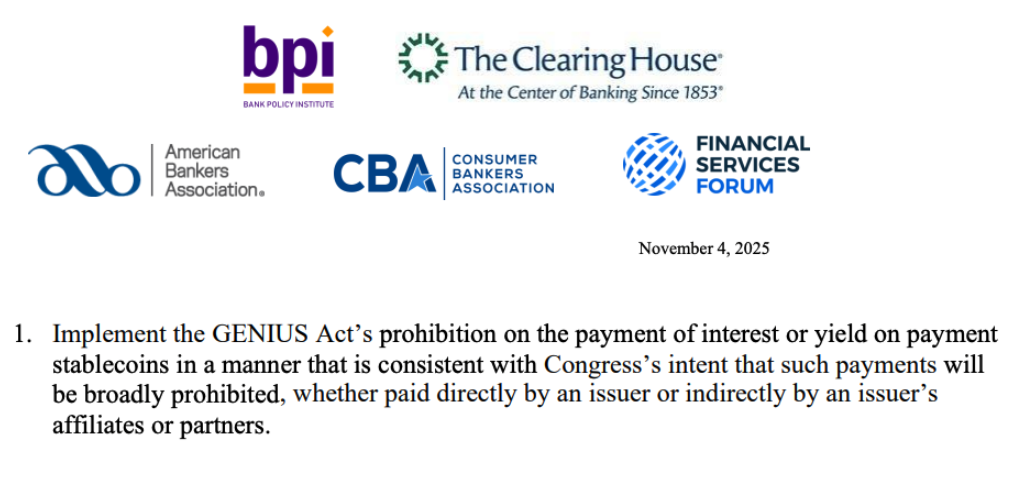 В совместном заявлении в среду BPI и несколько банковских групп заявили, что призвали Казначейство продлить запрет на процентные выплаты по стейблкоинам поставщикам услуг цифровых активов, включая биржи и филиалы.