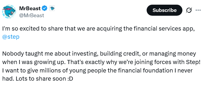 Beast Industries, развлекательная компания, основанная YouTube-блогером Джимми «MrBeast» Дональдсоном, приобретает Step, мобильное банковское приложение, ориентированное на подростков и молодых людей, что отмечает ее самый значительный шаг в сфере финансов на сегодняшний день.