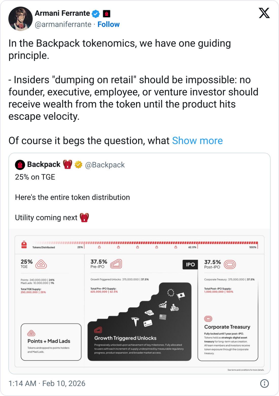 В отдельном посте соучредитель и генеральный директор Backpack Армани Ферранте написал на X в понедельник, что «руководящим принципом» разблокировки токенов является то, что «инсайдерский демпинг в розничной торговле должен быть невозможен».