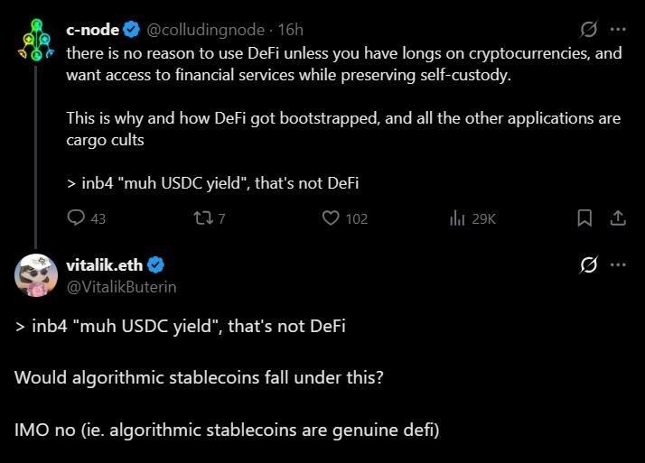 В обсуждении X Бутерин сказал, что ценность DeFi заключается в изменении способа распределения и управления рисками, а не просто в получении прибыли от централизованных активов.