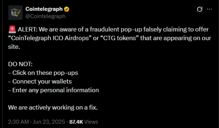 Официальная учетная запись Cointelegraph также опубликовала предупреждение, призывая пользователей не нажимать на всплывающие окна, подключать кошельки или предоставлять свою личную информацию.