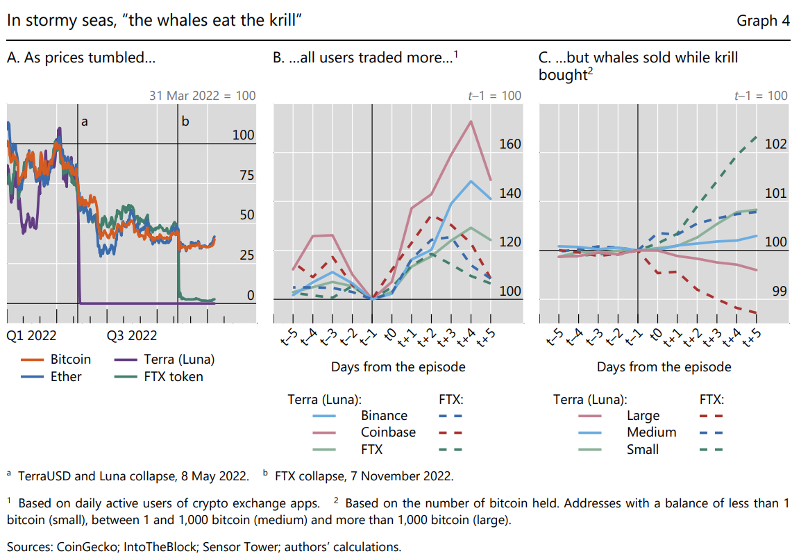 «Поскольку цены упали в 2022 году, пользователи фактически торгули больше», – отмечается в отчете BIS. «Наиболее тревожные, крупные держатели Биткоин (« киты ») продавали, поскольку обычные розничные инвесторы (« криль ») покупали». Он добавил: