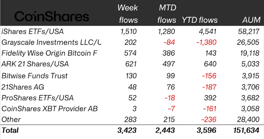 ETF BlackRock Ishares Etfs увидел самый большой приток на прошлой неделе на 1,5 миллиарда долларов, а Арк и Fidelity – 621 млн. Долл. США и 574 миллиона долларов соответственно.
