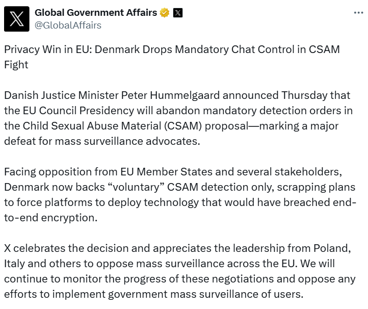 Команда X по вопросам глобального правительства заявила в субботу, что выход Дании является «серьезным поражением для сторонников массовой слежки», и платформа «продолжит следить за ходом этих переговоров и противодействовать любым усилиям по осуществлению государственной массовой слежки за пользователями».