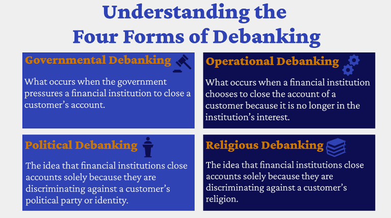 Аналитик Института Катона Николас Энтони объяснил в отчете в четверг, что дебанкинг может принимать несколько форм: религиозную или политическую, идею о том, что финансовое учреждение закрывает счета исключительно из-за политических или религиозных убеждений или принадлежности;операционный, когда банк решает закрыть счет клиента, поскольку это больше не в интересах банка;или правительство, когда правительство оказывает давление на финансовое учреждение, чтобы оно закрыло счет клиента.