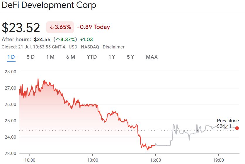 Последнее приобретение и ралли Соланы не смогли повысить цену акций Defi Development Corp, которые в понедельник упали на 3,65% до 23,52 долл. США. Тем не менее, он немного восстановился в нерабочее время до 24,55 долл. США.