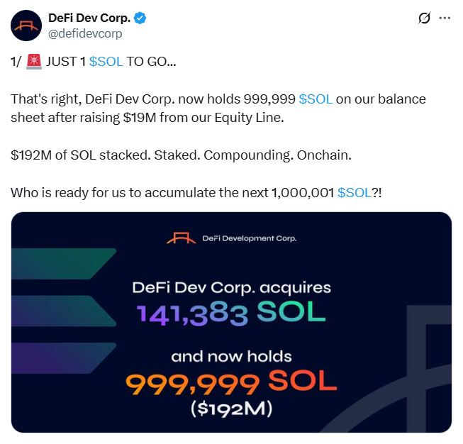 Фирма Defi Development, зарегистрированная на NASDAQ, в настоящее время находится всего в одном токене от пересечения миллиона Соланы в своем казначействе после последней покупки за 198 миллионов долларов.