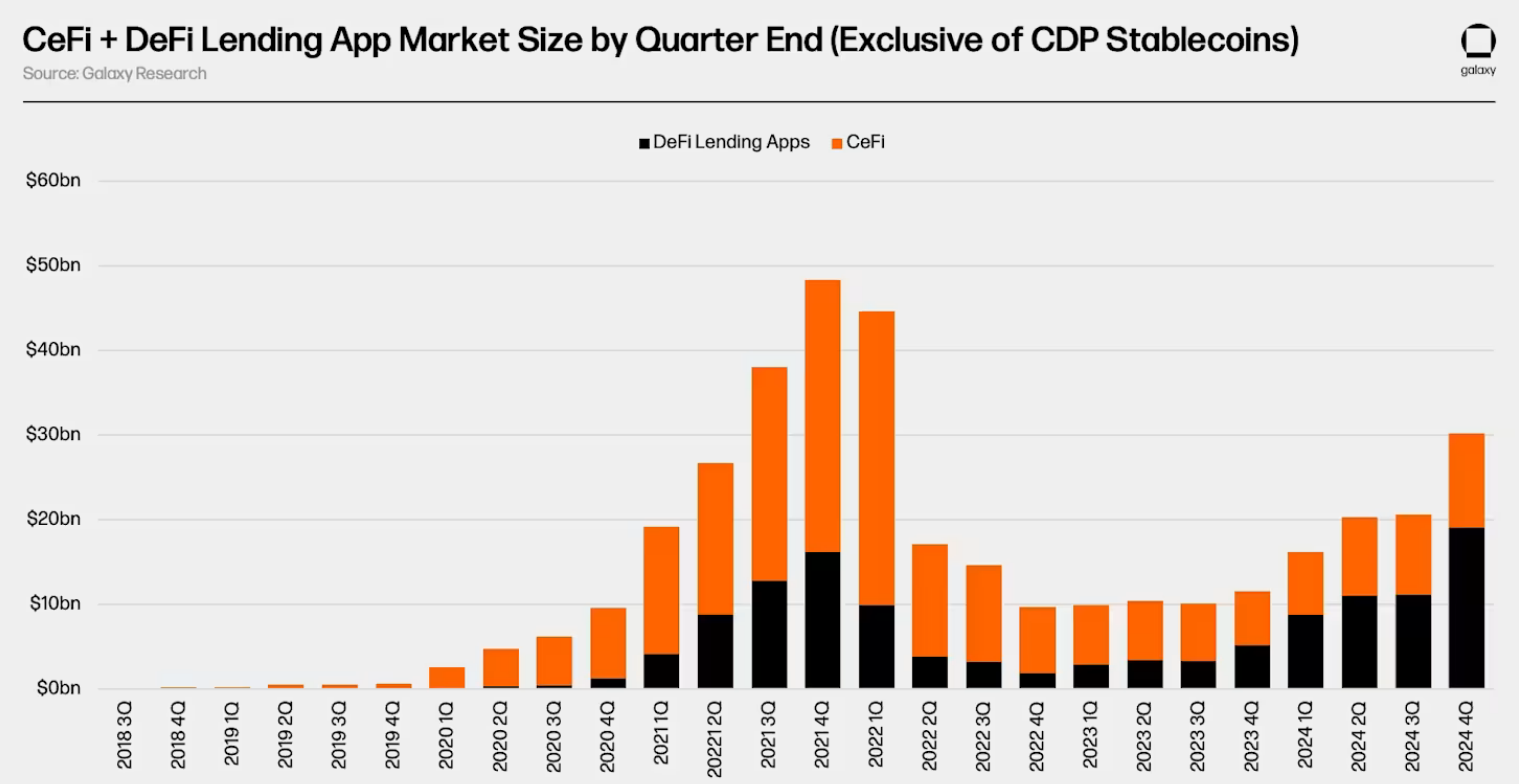 К концу 2024 года на базе Cryptocurrency на базе DEFI приходилось около 65% от общего рынка и увеличило или поддерживает свою долю рынка против централизованных кредиторов каждые квартал с 4 квартала 2022 года, как показано в апрельском отчете инвестиционной компании Cryptocurrency Galaxy Digital.