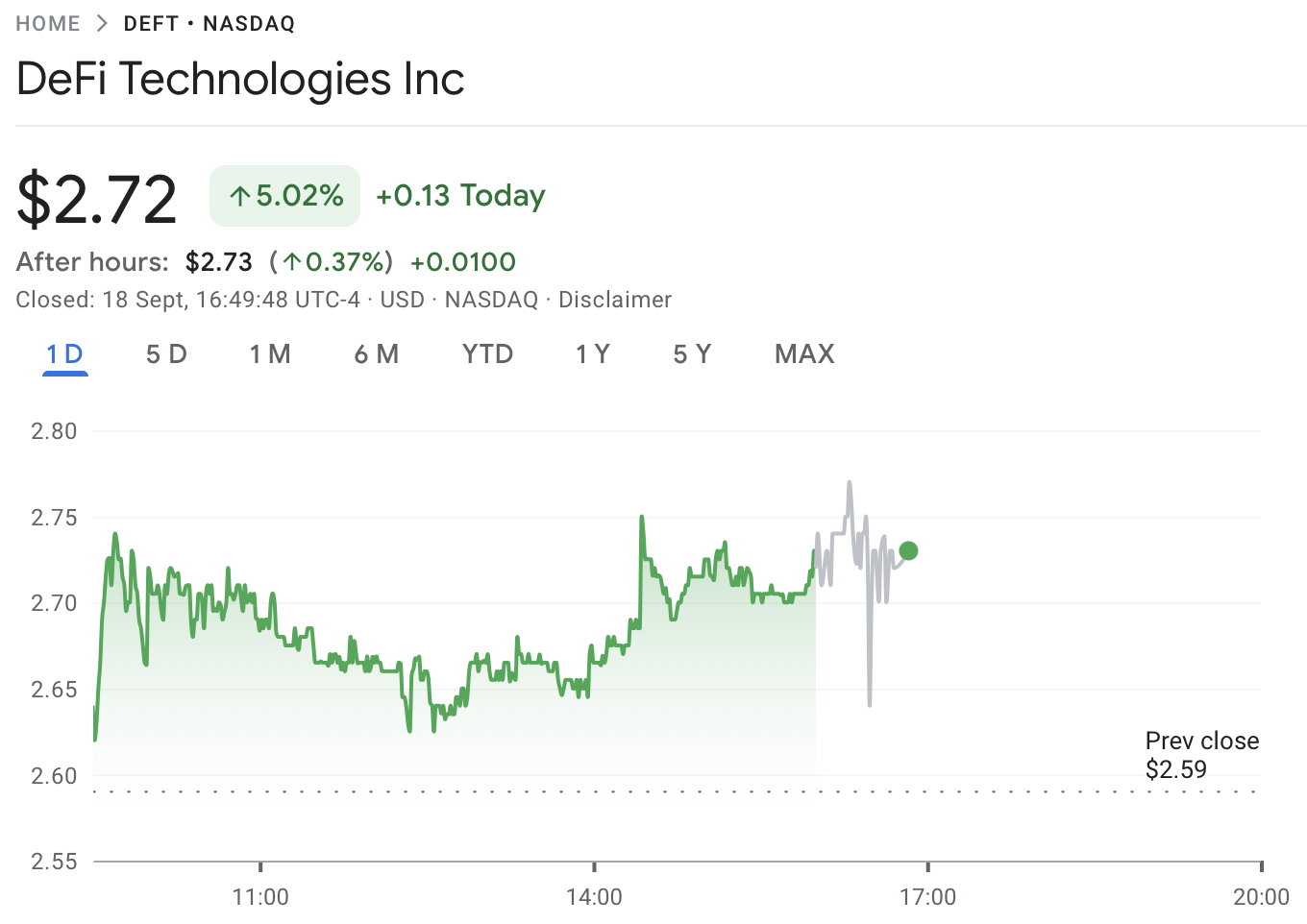 Согласно данным Google Finance, акции Defi Technologies, торгуемые на NASDAQ, закрылись на 5% в новостях.