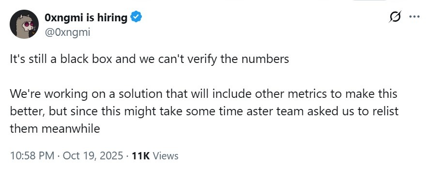 Отвечая на сообщение, 0xngmi сказал, что команде до сих пор не удалось проверить цифры, назвав это «черным ящиком». Он добавил, что, пока DefiLlama разрабатывает новую систему, включающую больше показателей, команда Астера тем временем попросила перерегистрировать ее.