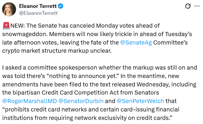 Повышение Сената на вторник произошло после того, как оно было отложено 15 января из-за споров по поводу ограничений на вознаграждения в стейблкоинах и других положений о децентрализованном финансировании, что привело к прекращению поддержки крупного игрока отрасли Coinbase.