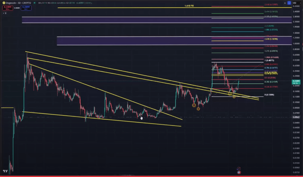 Взгляд Кевина основан на сильном историческом слиянии и зонах ретроса Фибоначчи. Он отметил, что последний крупный бычий цикл Догекоина видел, как токен достиг точно в диапазоне расширения от 1,618 до 1,703 Фибоначчи. Реплицируя ту же структуру FIB с самого последнего нижнего, Кевин определил аналогичный целевой диапазон от 1,10 до 1,25 долл. США, назвав его «целевой ценой реальной сделки», а не ClickBait.
