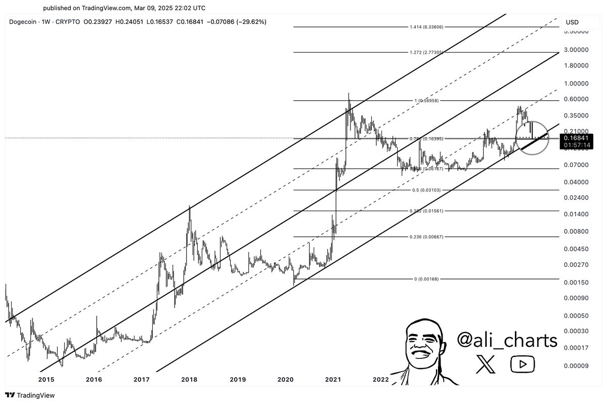 В новом посте о X аналитик Али Мартинес обсудил о долгосрочной формировании по еженедельной цене на догкоин. Рассматриваемый шаблон – это «восходящий канал» из технического анализа (TA), который является типом параллельного канала.