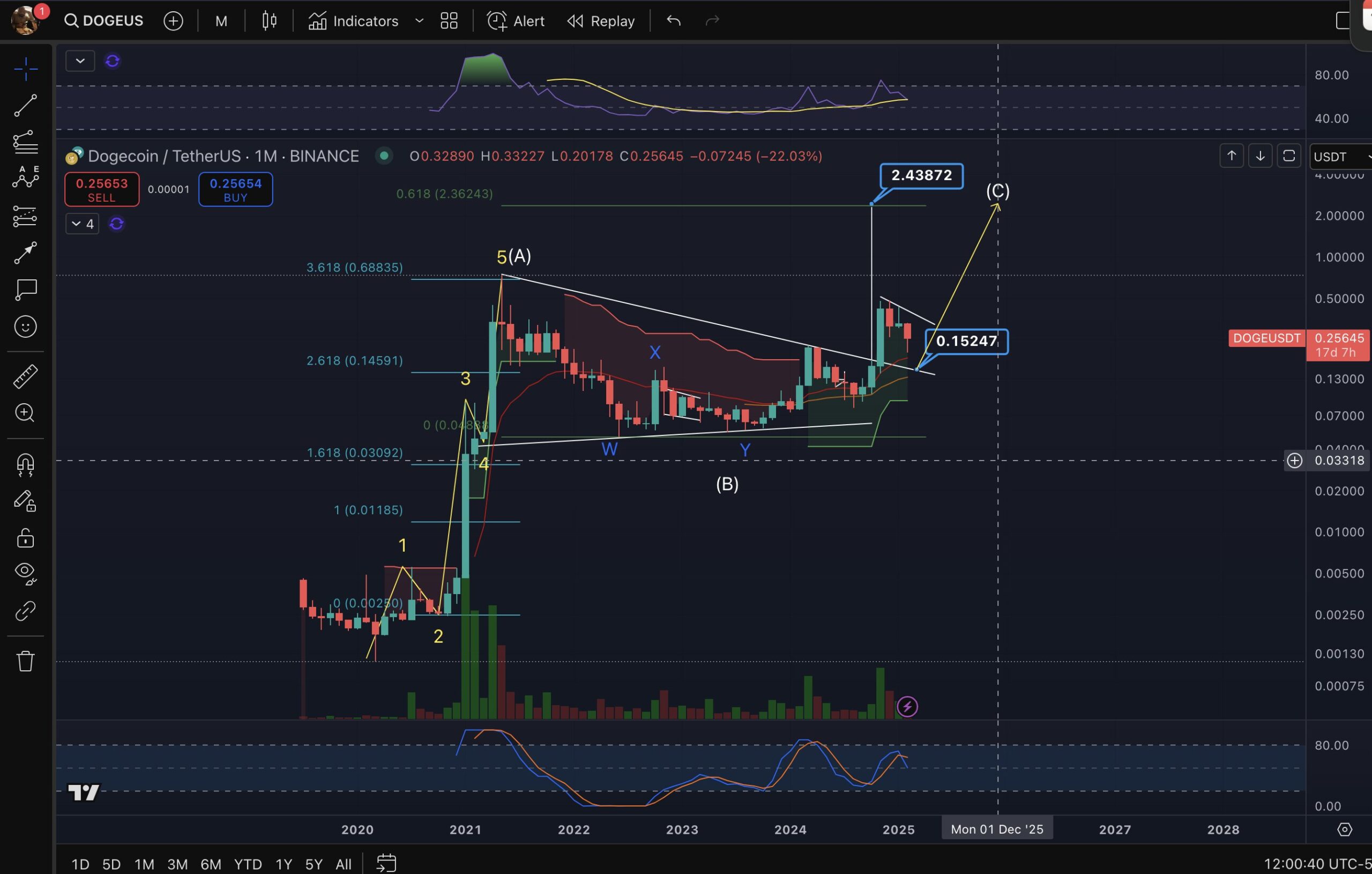 В терминологии волны Elliott, если импульсивное перемещение пятиволнового движения помечено (A), а последующая коррекция помечена (B), то следующая импульсивная структура обычно помечается (C). В общем диаграмме Big Mike проектирует, что эта волна (C) может поднять Dogecoin до 2,43 долл. США, что соответствует еще одной значительной ссылке на Фибоначчи от 2,36 до 2,43 долл. США. Трейдеры и аналитики часто смотрят на повреждения и расширения Фибоначчи, чтобы оценить потенциальную поддержку и уровни сопротивления, а в анализе волн Эллиотта эти соотношения могут помочь определить возможные конечные точки более крупных волн.