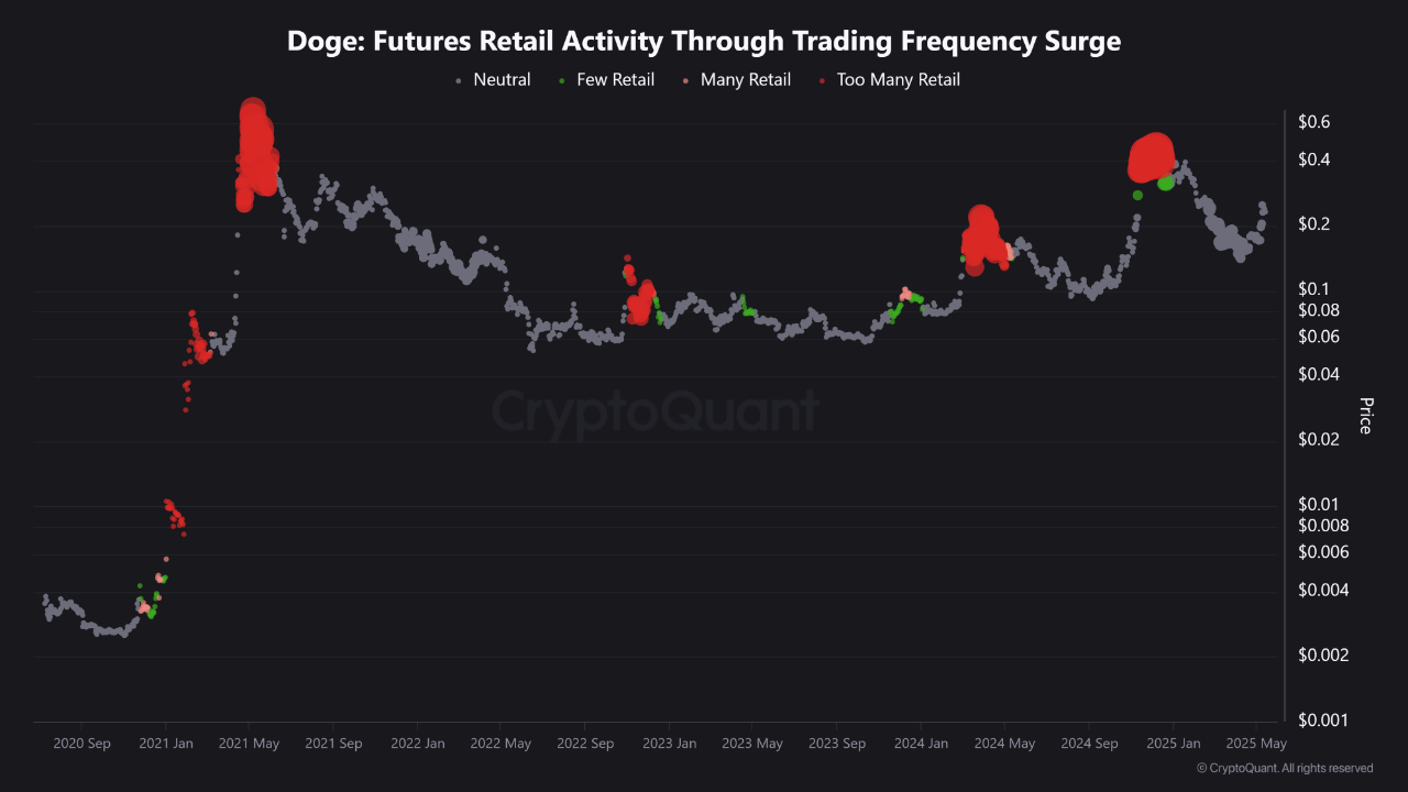 Основная интерпретация заключается в том, что когда фьючерсные рынки Doge становятся насыщенными участниками розничной торговли, вероятность истощения импульса увеличивается. Для трейдеров эти розничные шипы могут служить потенциальными предупреждающими сигналами краткосрочных изменений.