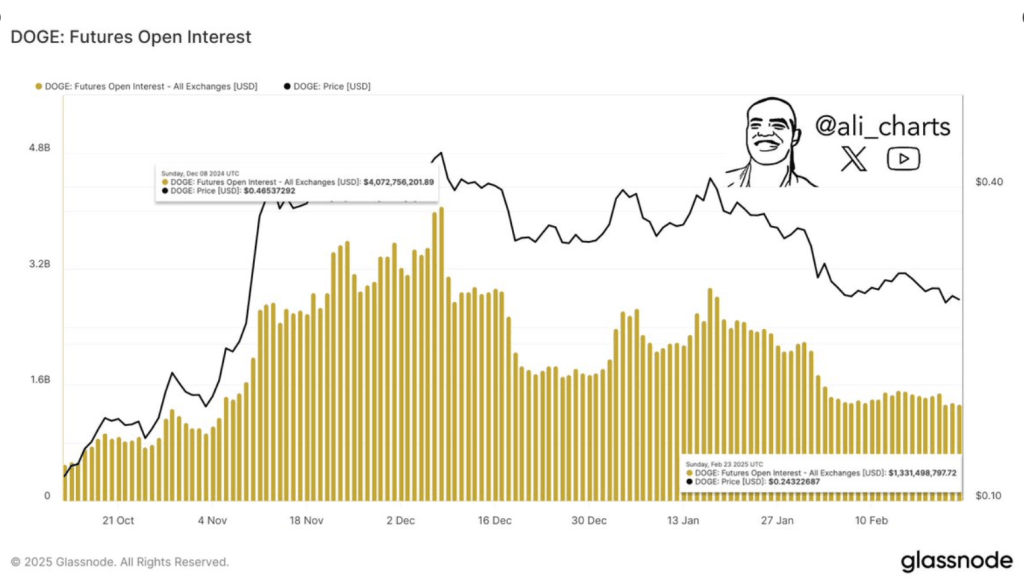 Энтузиазм инвесторов по поводу догекоина резко снижается. Более 67% открытых процентов на мем -монете снизились за три месяца. В декабре 2024 года это увидел 4,07 миллиарда долларов. К февралю 2025 года он упал до 1,33 миллиарда долларов. Это значительное снижение предполагает осторожность на рынке. Многие трейдеры отступают из -за неопределенности на более широком рынке криптовалют.