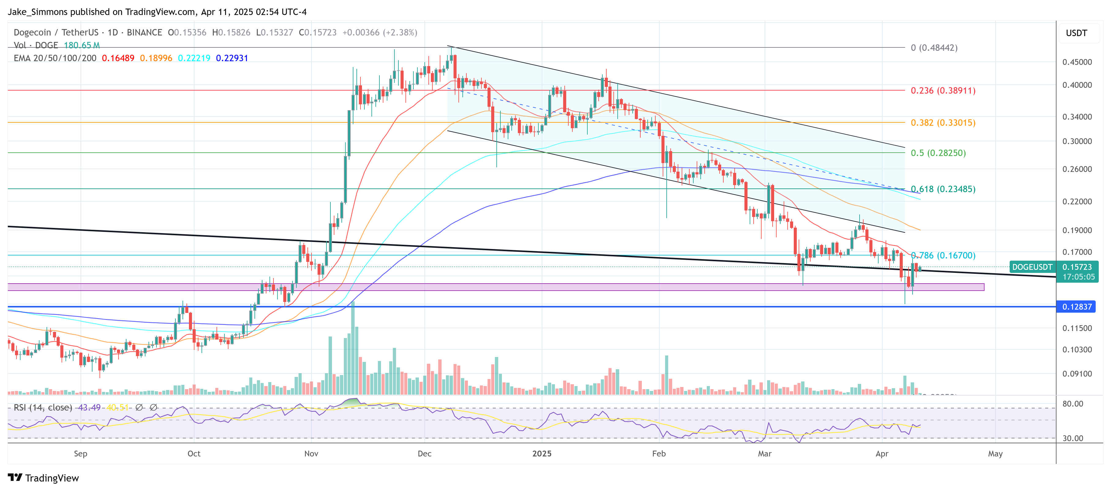 На графике демонстрируется резкий рост Dogecoin с менее чем цента в 2020 году до своего рекордно высокого уровня около 0,74 долл. США в 2021 году, прежде чем отступить до того, что, по-видимому, является значительной поддержкой около 0,15 долл. США. Наложение рецидива аналитика в FIB показывает уровень 0,382 на уровне около 0,14225 долл. США, область технического значения, которая привлекло новое внимание. Нынешнее ценовое действие изображено как оседание вокруг зоны, где многолетняя линия нисходящей линии тренда (желтый) соответствует уровню Fib 0,382, окруженной на графике как потенциальный поворотный момент.