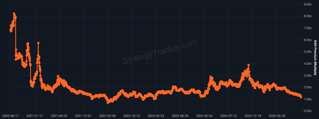 По данным StrategyTracker, снижение цен на биткоин и акции Strategy привело к сокращению mNAV до 1,05x, упав с пика в 3,89x в ноябре после того, как биткоин резко взлетел после победы Дональда Трампа на выборах в США.