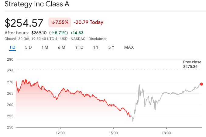 Акции Strategy выросли почти на 6% после закрытия, поскольку казначейская компания Bitcoin сообщила о чистой прибыли в размере $2,8 млрд за третий квартал, что меньше, чем во втором квартале, но все же превзошло ожидания аналитиков.