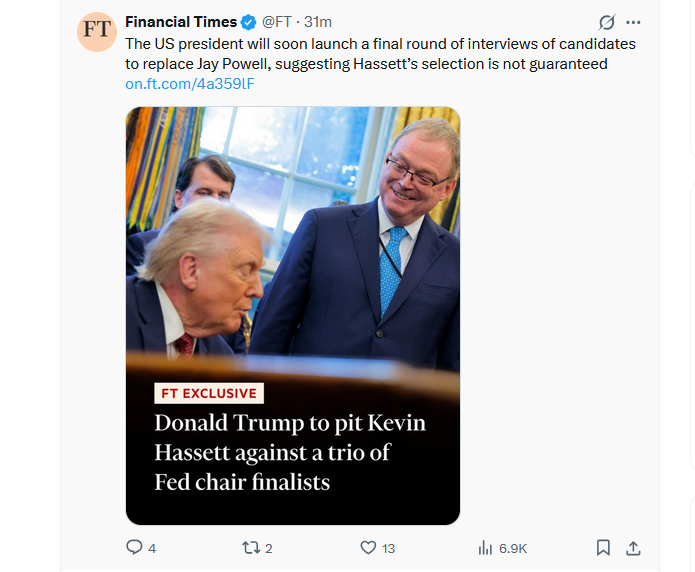 Согласно сообщению Financial Times (FT) во вторник, министр финансов Скотт Бессент представил Белому дому список из четырех имен.
