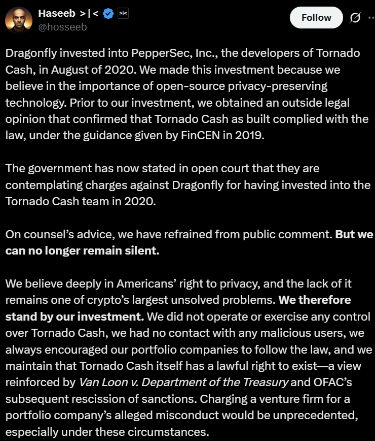 В пятничной посте в социальных сетях, партнер Dragonfly Capital Managing Haseeb Qureshi защищал раннюю поддержку фирмы Tornado Cash-протокол с открытым исходным кодом, который позволяет пользователям скрывать транзакции блокчейна-начиная с августа 2020 года.