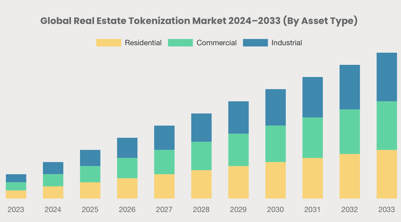 Согласно индивидуальному рынку, мировой рынок токенизации по недвижимости, как ожидается, достигнет рыночной капитализации в 19,4 млрд долларов к 2033 году, растущий по совокупным годовым показателям 21%. Все три типа недвижимости – жилой, коммерческой и промышленной – будут играть роль.