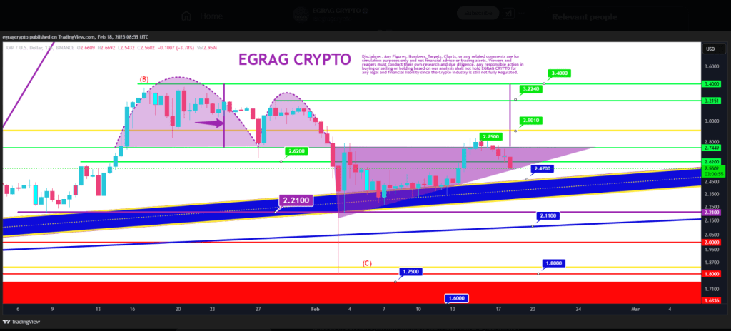 XRP в настоящее время торгуется на уровне 2,56 долл. США после внутридневного пика в размере 2,60 долл. США и минимума 2,45 долл. США. Снижение совпадает с периодом быстрого увеличения стоимости для токена. Согласно криптовалюты EGRAG, XRP все еще находится в структурированном рисунке даже с откатом;Если подтверждено, это может привести к увеличению увеличения.