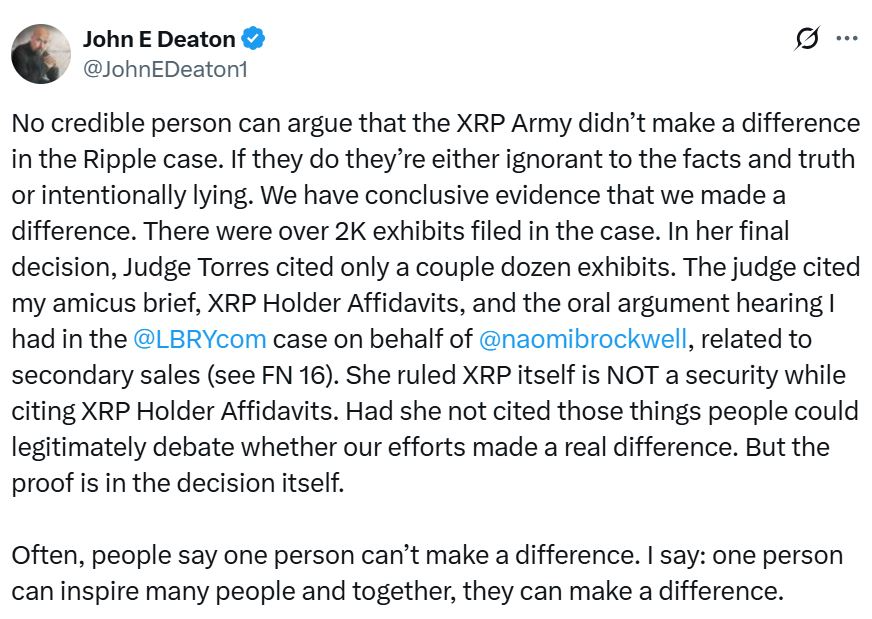 Deaton сплотил держателей XRP, чтобы представить письменные показания и сделать свидетельства в случае Ripple, а на протяжении многих лет армия XRP лоббировала, ходатайствовала и скоординировала кампании в социальных сетях с регуляторами давления.