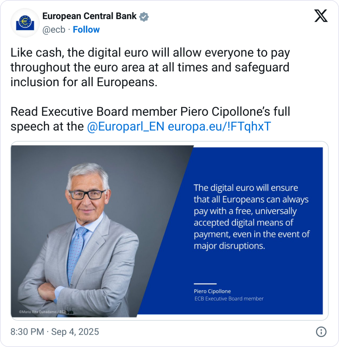 Cipollone сказал, что ЕЦБ работает в предположении, что цифровое законодательство евро будет действовано ко второму кварталу 2026 года.