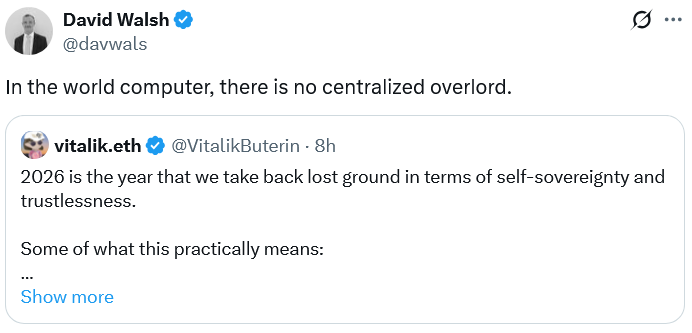 «2026 год — это год, когда мы вернем утраченные позиции с точки зрения самосуверенитета и недоверия», — написал Бутерин X в пятницу:
