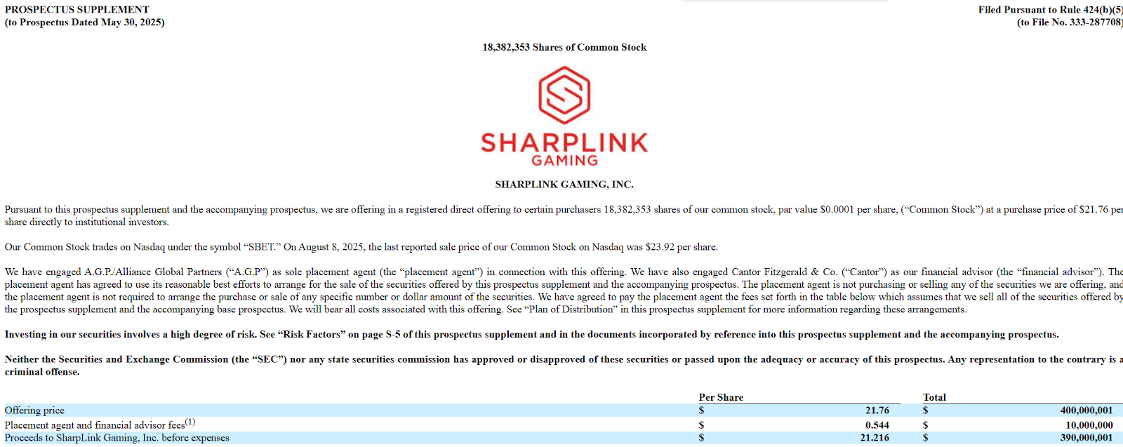 Предложение Bitmine поступило в тот же день, что и корпоративная казначейская компания Crorpotocurrenty Sharplink завершила увеличение капитала в размере 389 миллионов долларов США от обыкновенных акций, проданных для избранных институциональных инвесторов, согласно еще одной подаче SEC. «Мы намерены внести практически все выручки от денежных средств, которые мы получаем для приобретения ETH», – говорится в заявлении.