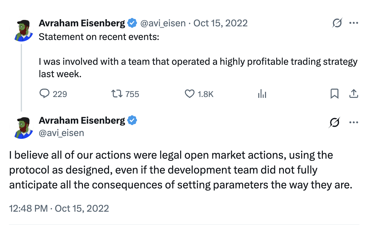 Эйзенберг защищал эксплу, утверждая, что ограбление в 100 миллионов долларов было сделано с помощью «законных действий на открытом рынке», и заявил, что он договорился о расчете на возврат средств пользователей после того, как страховой фонд обмена не покрыл дефицит.