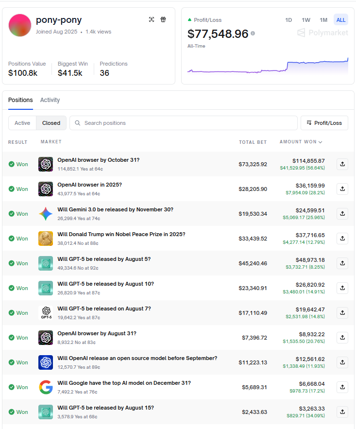 Пользователь Polymarket «пони-пони» может похвастаться 100% выигрышем и реализованной прибылью более 77 000 долларов США, делая ставки на события, связанные с компанией по разработке искусственного интеллекта OpenAI, сообщил агрегатор прогнозных рыночных данных Polymarket Money в сообщении Monday X.