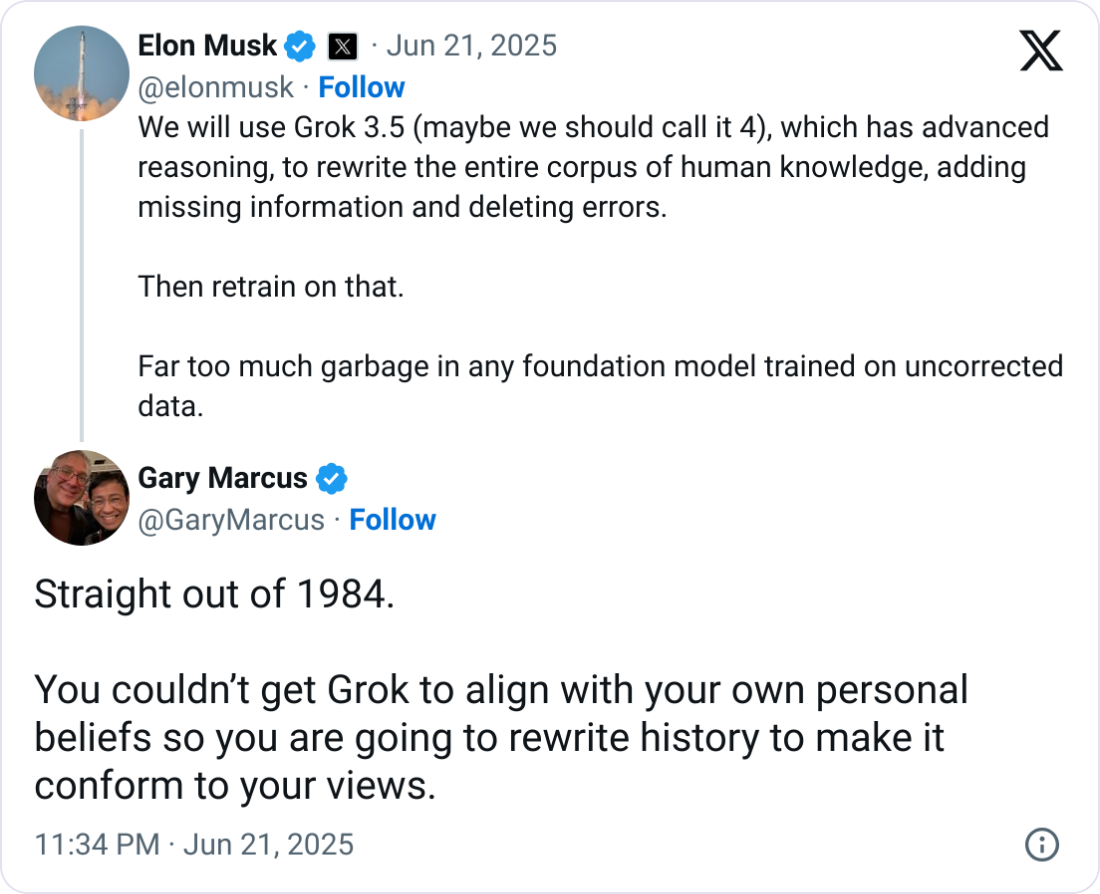 «Прямо из 1984 года», – написал Маркус на X. – Вы не могли заставить Грока соответствовать своим личным убеждениям, чтобы вы переписывали историю, чтобы она соответствовала вашим взглядам ».