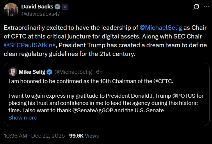Его комментарии последовали за событиями в CFTC, включая смену руководства с участием Майка Селига, подчеркнув ожидания более четкой нормативной базы для цифровых активов.