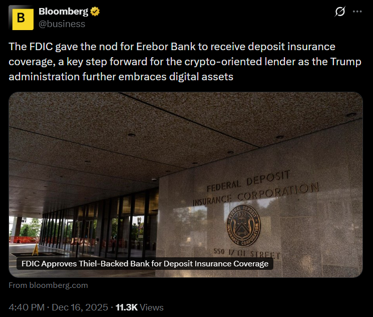 Erebor недавно получил предварительное условное одобрение от Управления денежного контролера США (OCC), что является ключевым нормативным препятствием на пути к тому, чтобы стать полностью лицензированным банком.